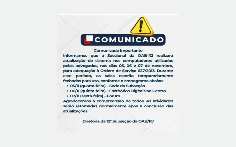 A OAB Seccional Rio de Janeiro realizará uma importante atualização de sistema nos computadores utilizados pelos profissionais, conforme estabelece a Ordem de Serviço 627/2013.