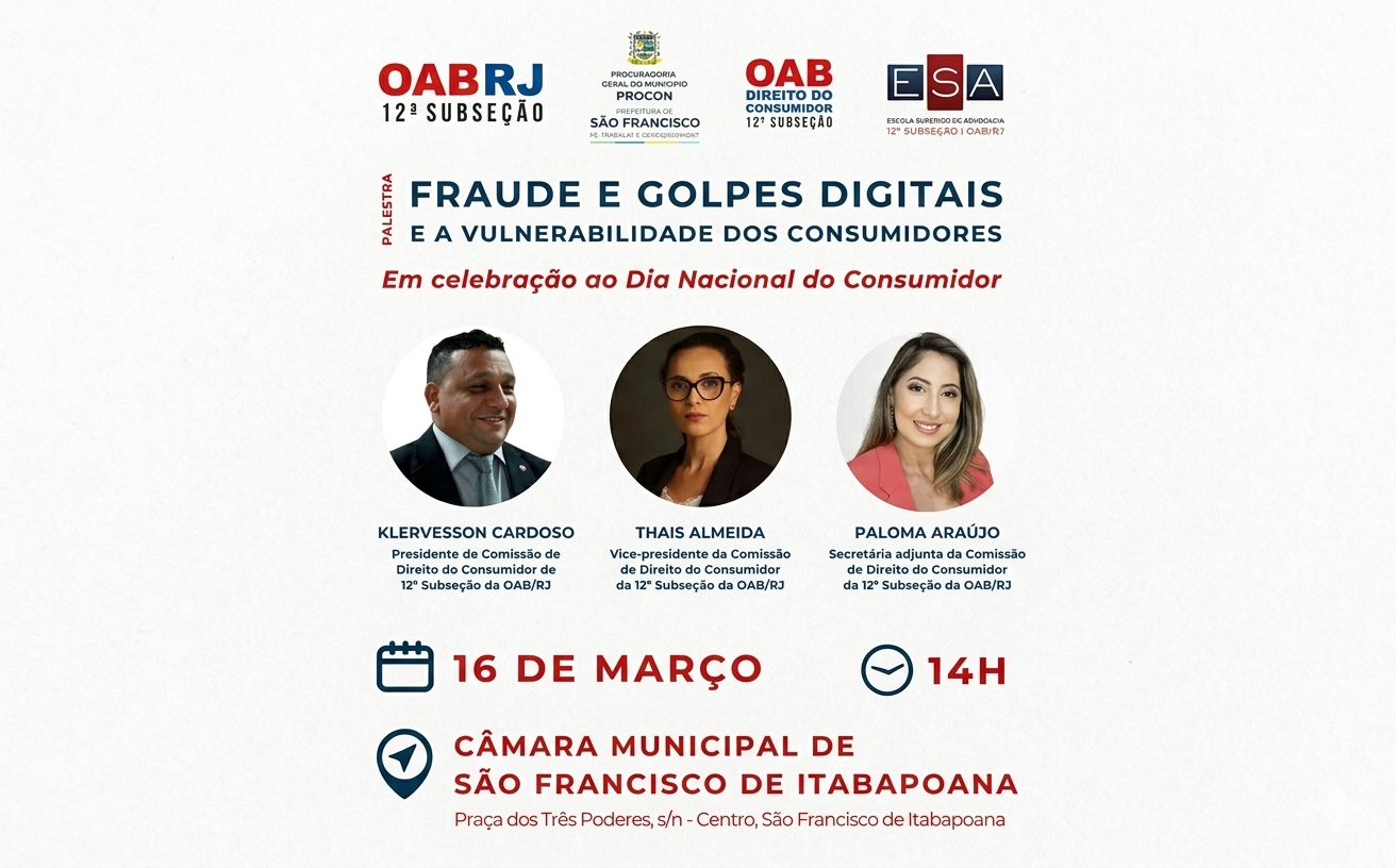 Em comemoração ao Dia Nacional do Consumidor, a 12ª Subseção da OAB/RJ, por meio de sua Comissão de Direito do Consumidor, realiza na próxima segunda-feira, 16 de março, um evento crucial para a segurança dos cidadãos: a palestra “Fraude e Golpes Digitais e a Vulnerabilidade dos Consumidores”.
