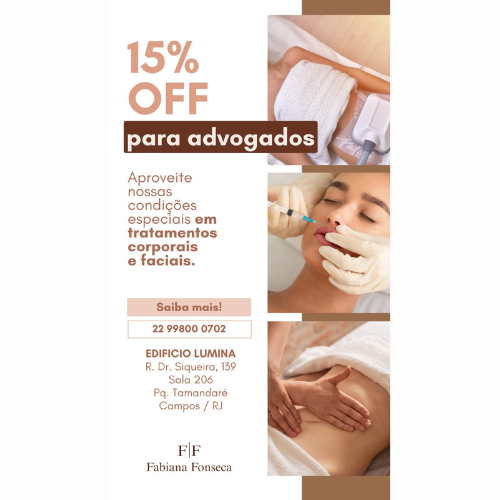 PARCERIA OAB-12a Subseção. A Fisioterapeuta, Enfermeira e Acupunturista Dermato Funcional Dra. Fernanda Siqueira, localizada RUA BARÃO DA LAGOA DOURADA 324, CENTRO CAMPO DOS GOYTACAZES/ RJem Campos dos Goytacazes, firmou uma parceira com a OAB-12a Subseção e agora Advogados, Advogadas, Estagiários e funcionários da OAB-RJ, tem DESCONTO de 15% (quinze por cento) por sessão em diversos tratamentos."