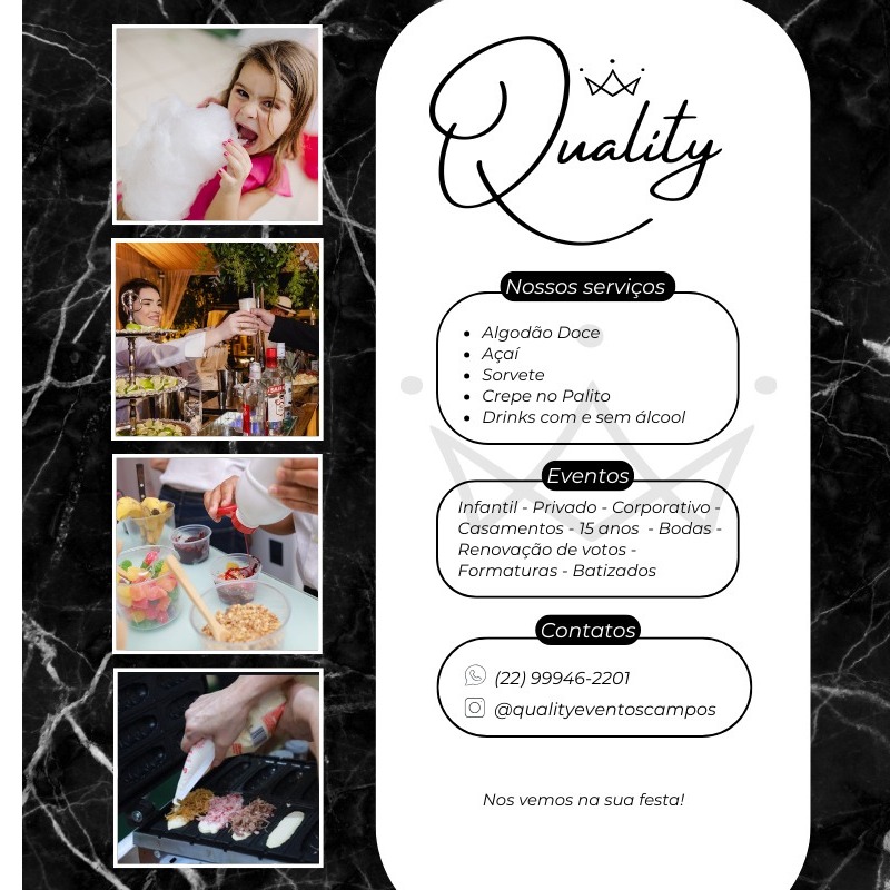 Somos uma empresa que presa pela qualidade em atendimento e nos serviços que oferecemos, sendo eles: Bar com drinks com e sem álcool, crepe no palito doces e salgados, Açaí e servete com guloseimas e coberturas, Sorvete e Algodão doce no palito para eventos em geral.
